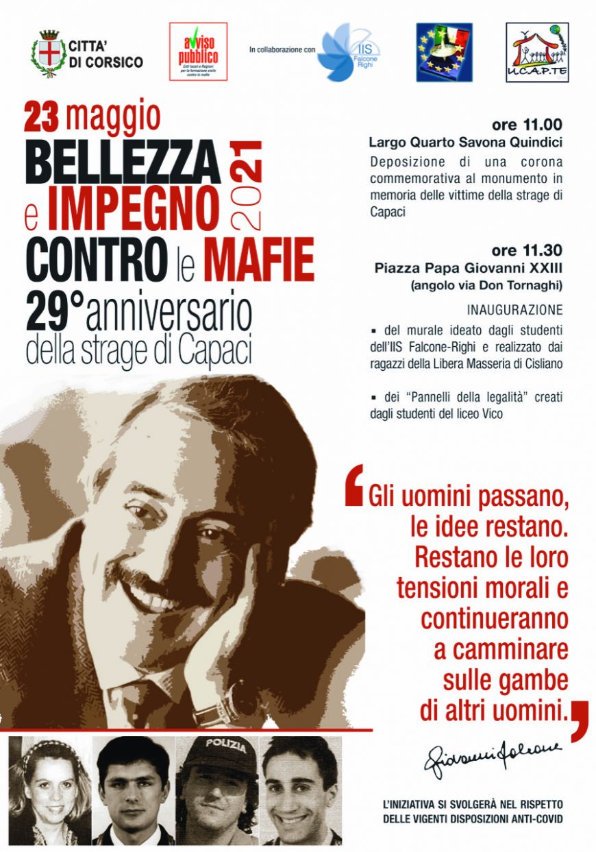 Domenica 23 maggio, alle ore 11.00, presso il monumento in memoria delle vittime della strage di Capaci sito in Largo Quarto Savona Quindici a Corsico (MI) si terrà la commemorazione per il 29° anniversario dalla strage di Capaci in ricordo di Giovanni Falcone, della moglie Francesca Morvillo e dei ragazzi della scorta Vito Schifani, Rocco Dicillo e Antonio Montinaro.