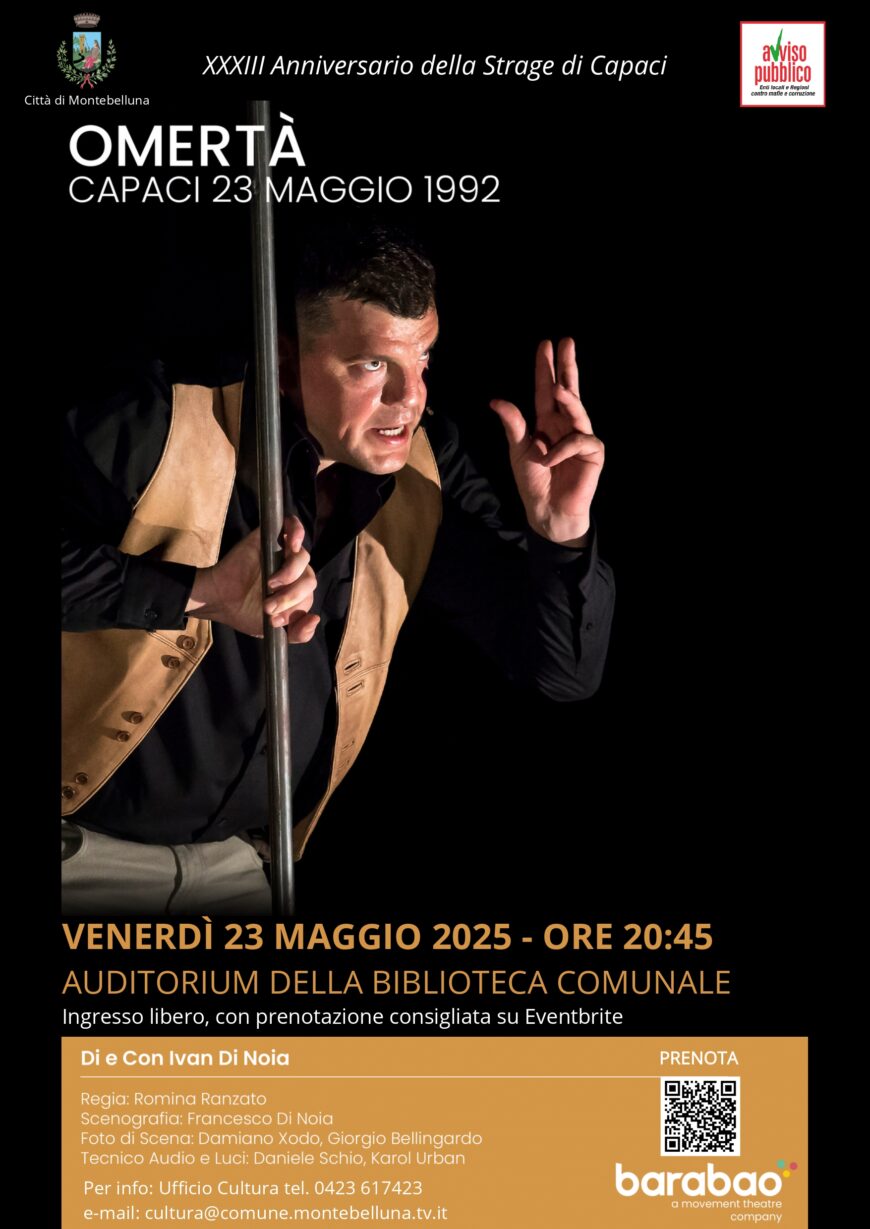 In occasione della Giornata della Legalità, venerdì 23 maggio il Comune di Montebelluna promuove per il 33° anniversario della Strage di Capaci, lo spettacolo teatrale “Omertà” di e con Ivan Di Noia.
