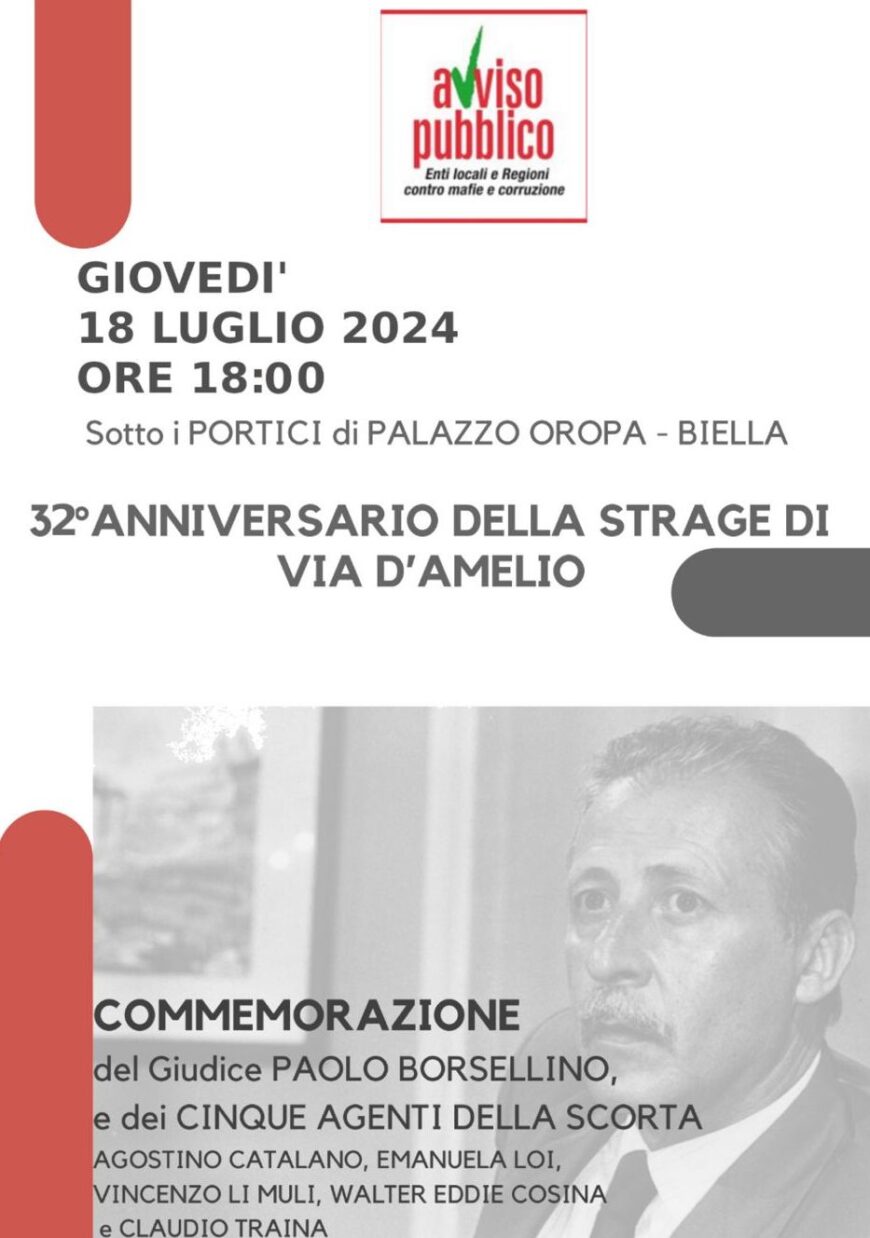 In occasione del trentaduesimo anniversario della Strage di Via D’Amelio, il Comune di Biella organizza per giovedì 18 luglio alle ore 18.00, sotto i Portici di Palazzo Oropa, la cerimonia di commemorazione per il giudice Paolo Borsellino e i cinque agenti della sua scorta: Agostino Catalano, Emanuela Loi, Vincenzo Li Muli, Walter Eddie Cosina e Claudio Traina, restati uccisi nell’attentato.