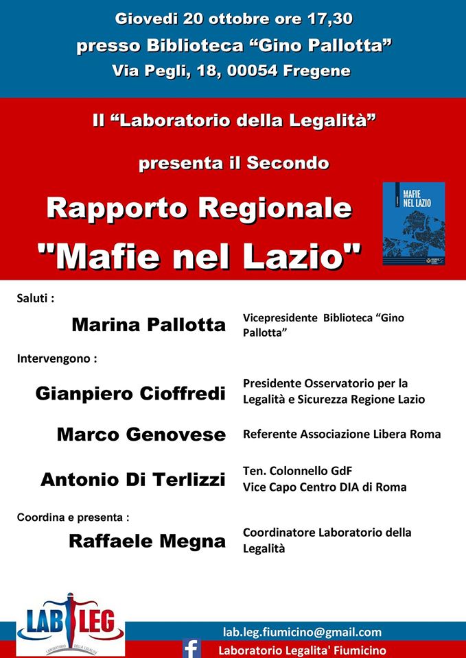 Si svolgerà giovedì 20 ottobre, alle ore 17.30, la presentazione del Secondo Rapporto Regionale “Mafie nel Lazio” presso la Biblioteca “Gino Pallotta” a Fregene (Via Pegli, 18). […]Leggi tutto Presentazione Secondo Rapporto Regionale “Mafie nel Lazio”: Fregene, 20 ottobre