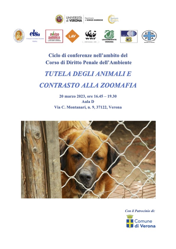 Prosegue il ciclo di conferenze nell’ambito del Corso di Diritto Penale dell’Ambiente, presso l’Università degli studi di Verona. Il secondo incontro dal titolo “Tutela degli animali e contrasto alla zoomafia” è previsto per lunedì 20 marzo dalle 16.45 alle 19.30, presso l’Aula D del Dipartimento di Scienze Giuridiche.