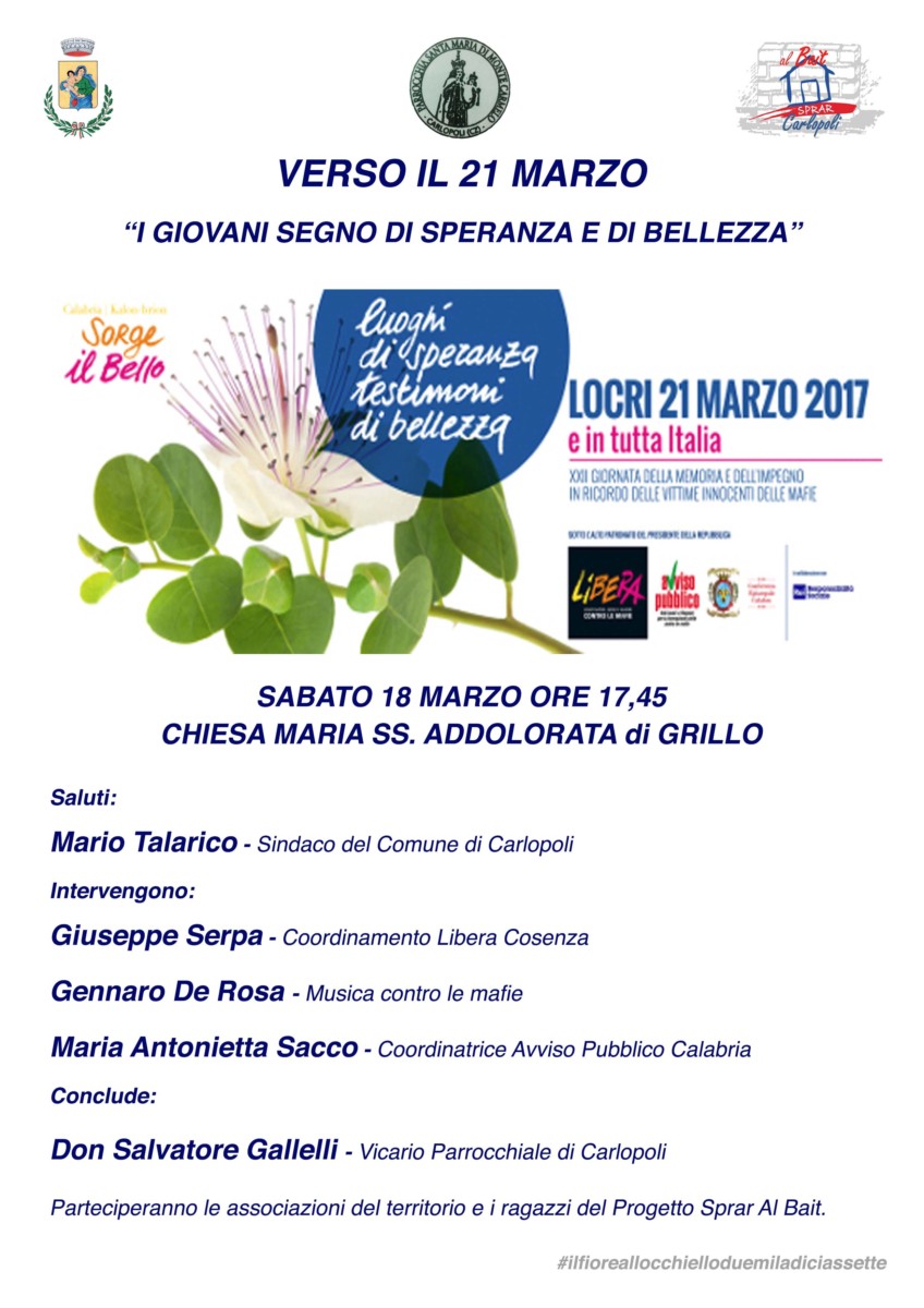 Si svolgerà sabato 18 marzo a Carlopoli, alle ore 17.45 presso la Parrocchia Maria SS del Monte Carmelo, il secondo incontro organizzato a Carlopoli nell’ambito delle iniziative di sensibilizzazione e avvicinamento alla XXII Giornata della Memoria e dell’Impegno in ricordo delle vittime innocenti di tutte le mafie, quest’anno in programma a Locri (RC) il 21 marzo.
