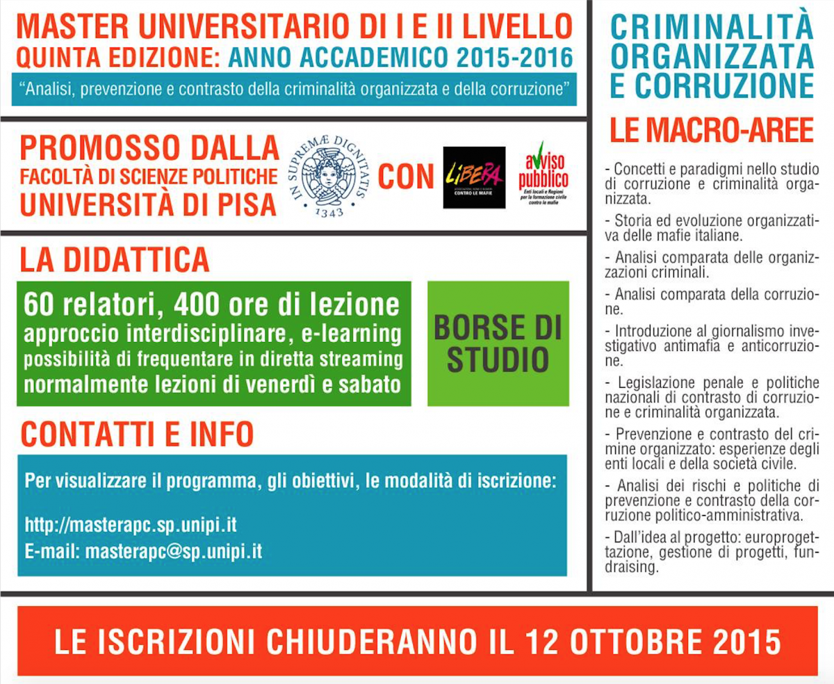 Sono aperte le iscrizioni alla VI edizione del Master “Analisi, prevenzione e contrasto della criminalità organizzata e della corruzione” (APC), organizzato presso il Dipartimento di Scienze Politiche dell’Università di Pisa, in partnership con Libera e Avviso Pubblico.