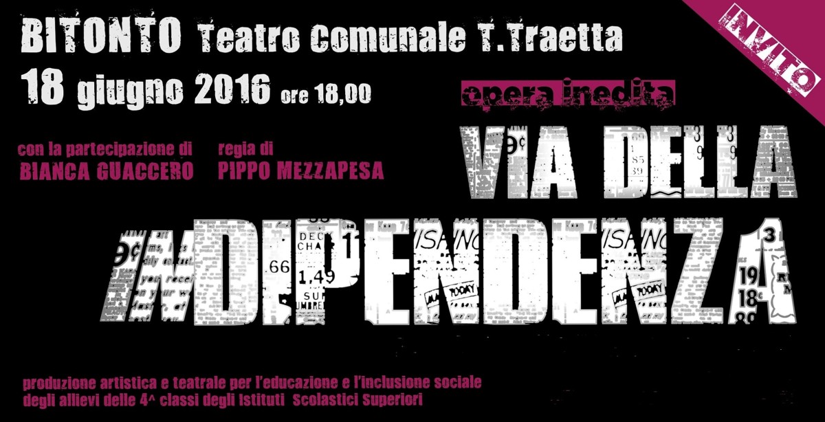 Si svolgerà il 18 giugno, alle ore 18.00 presso il teatro comunale Traetta di Bitonto, la messa in scena di “Via della Indipendenza”, per la regia di Pippo Mezzapesa e con la partecipazione di Bianca Guaccero.