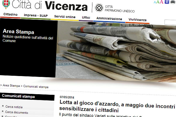 Venerdì 9 maggio, alle 16 nel Palazzo delle Opere Sociali di piazza Duomo 2, il convegno “Occhio al gioco. Per non perdere di vista la tua vita… quando il gioco diventa dipendenza”, organizzato dall’Associazione per la difesa e l’orientamento dei consumatori (Adoc) con Uil e Comitato cittadino di Creazzo, in collaborazione con Pro Loco di Creazzo e Veneto Consumatori, e col patrocinio dei Comuni di Vicenza e Creazzo, e della Provincia. A rappresentante Avviso pubblicoci sarà Raffaele Colombara, Consigliere Comunale di Vicenza.