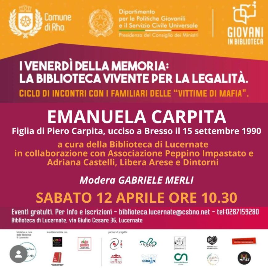 Il prossimo appuntamento è per sabato 12 aprile alle 10.30, presso la Biblioteca di Lucernate, in via Giulio Cesare 36, con Emanuela Carpita, figlia di Piero Carpita, ucciso a Bresso il 15 settembre 1990.