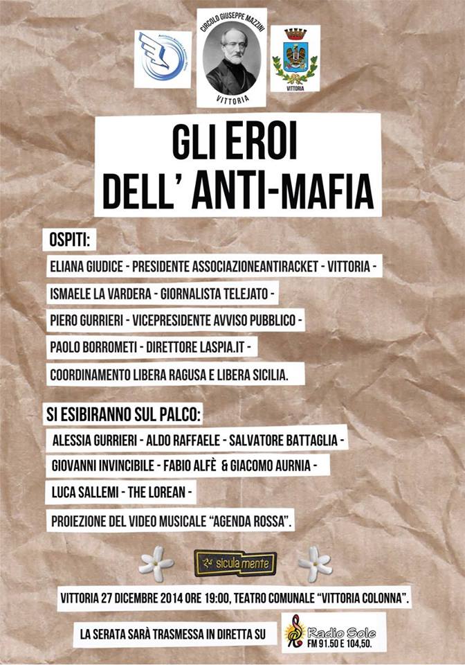 Vittoria, 27 dicembre: “Gli Eroi dell’Antimafia” Posted on 27 Dicembre 201412 Gennaio 2015 by Giulia Migneco Vittoria, 27 dicembre 2014, incontro pubblico “Gli Eroi dell’Antimafia”, presso il teatro comunale “Vittoria Colonna”. Per Avviso Pubblico sarà presente il Vicepresidente, Piero Gurrieri. Condividi